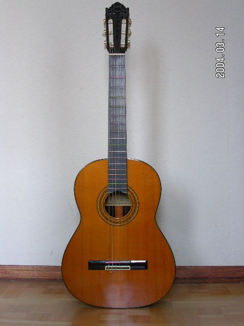 中出阪蔵さんの楽器は2本目です。購入するとき、中出阪蔵さんから、最初は、弦長630mmのギターを2本送って貰いました。内部の構造はブーシェでした。表面板は北米産のレッドウッドを使用してました。とても綺麗な柔らかい音色で弾きやすかった。背面が少し濃い木目だったのを記憶しております。
