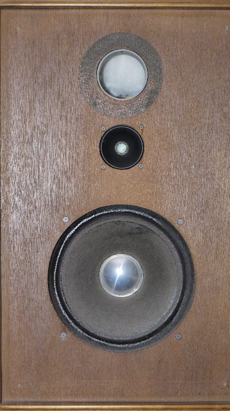 気になったのは、前面のネットが僅かに湾曲しています。SANSUIのネジ式の丸型のマークが、空回りして緩んでいる状態でネットの木枠に接触していました。この緩みが振動して木枠にこすれて雑音を発生させていると考えました。右に回して締め付けようとしても締まりません。逆回しして取り外して木工ボンドをネジ穴に入れて固定することも考えましたが、結局左回しで緩めてネットの木部から離れた固定できる点で止めました。他に前面ネツトの木枠に接着外れなどが無いかも確認しました。雑音の原因がはっきりしないです。